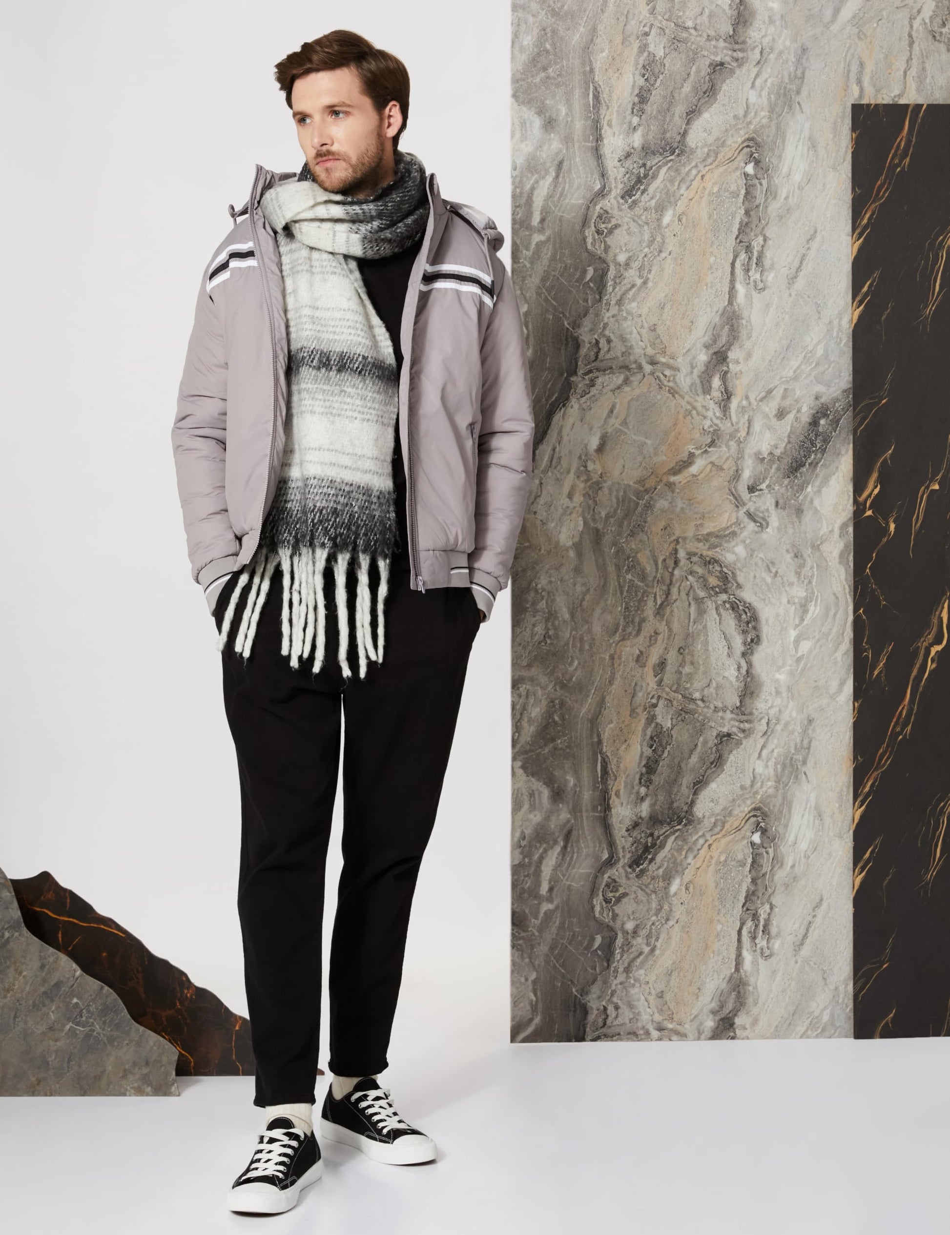 Layer up in style with Stone Grey Hooded Bomber Jacket - your heavyweight champion for brutal winter days. Built from 100% polyester with quilted construction, this jacket delivers serious insulation without weighing you down. The detachable hood gives you flexibility, while the zip-through front makes layering effortless. Functional side pockets plus an inner mobile pocket keep your essentials close, and the ribbed bottom ensures a snug, comfortable fit that stays put. Perfect for mid to high winters, this quilted essential pairs beautifully with joggers and boots for that effortlessly warm aesthetic. Designed for comfort and built to last, this is the jacket that earns its place in every man's rotation. Stay warm, stay sharp, stay ready.