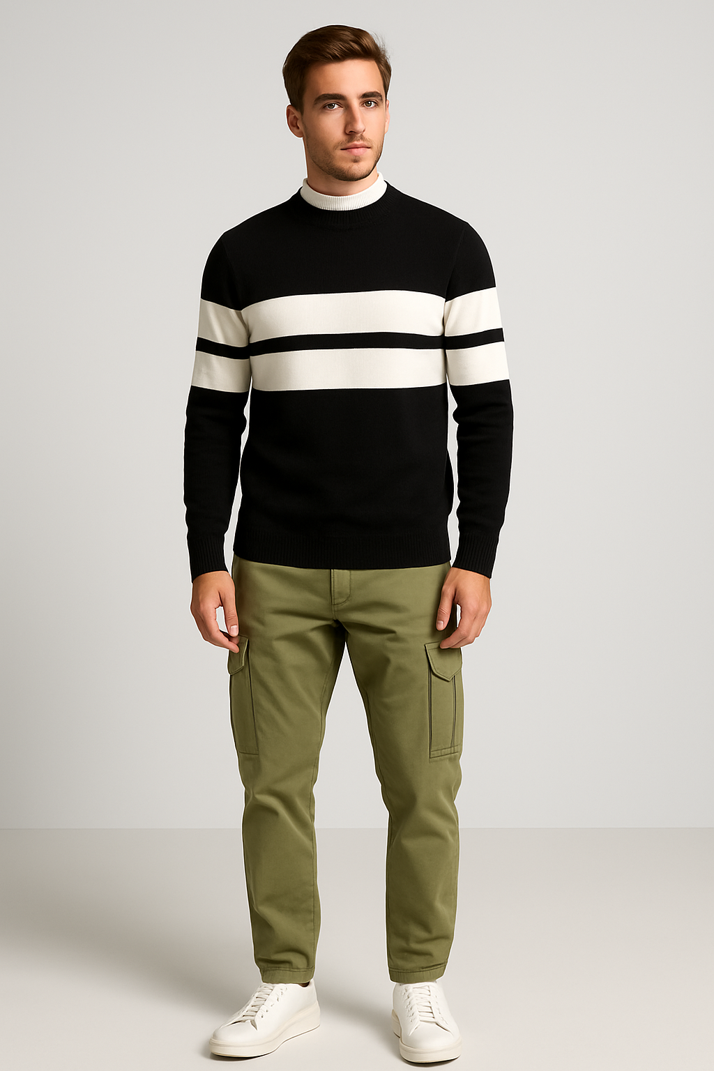 The bold black base with crisp white stripes adds a modern edge, while the regular fit and round neck make it versatile for all-day wear. With its full sleeves and color-block vibe, this tee works perfectly for casual hangouts, daily wear, or streetwear-inspired looks.