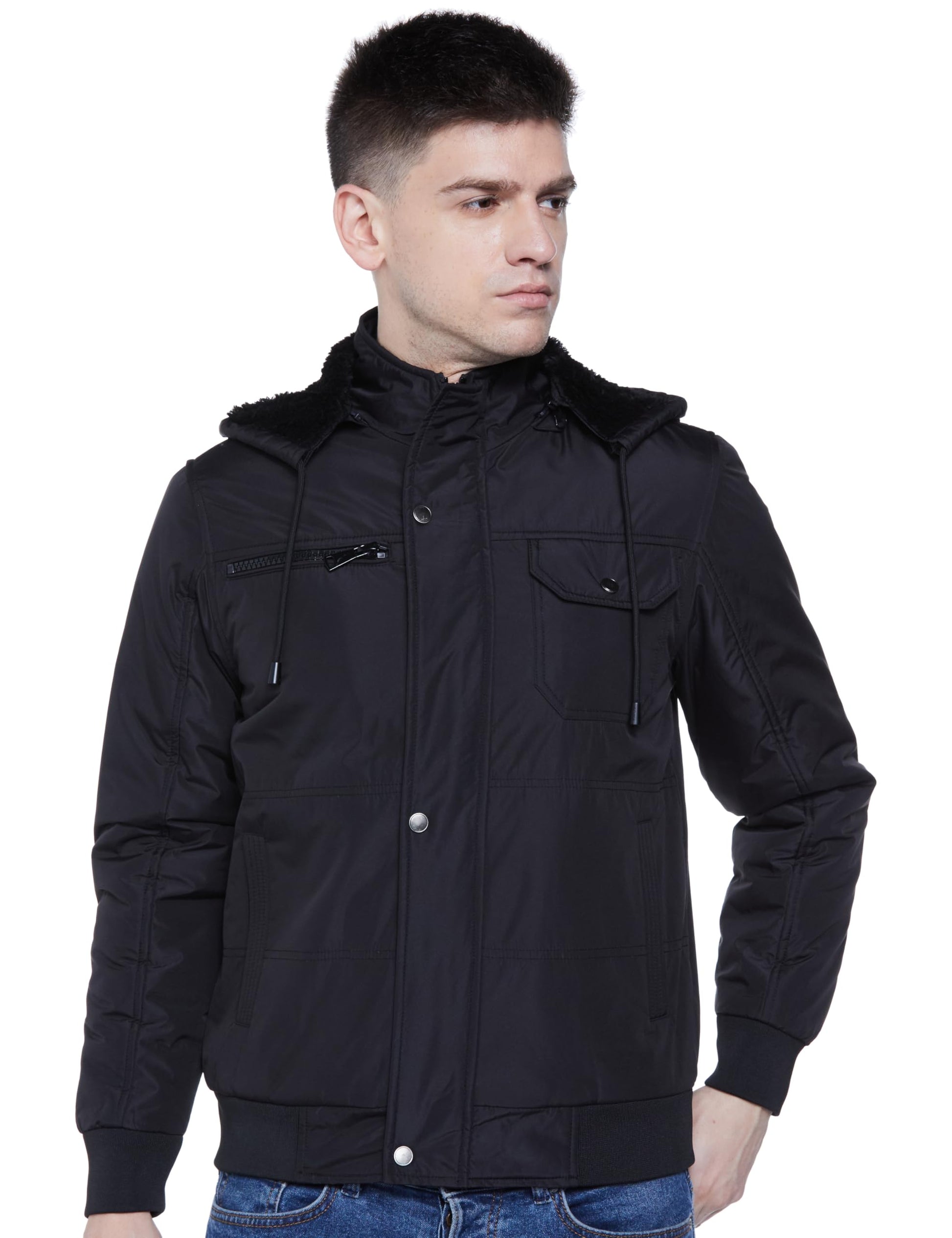 Men's Regular Fit Polyester Bomber Black Jacket with Inner Fur - Stylish Casual Hooded Winter Jacket